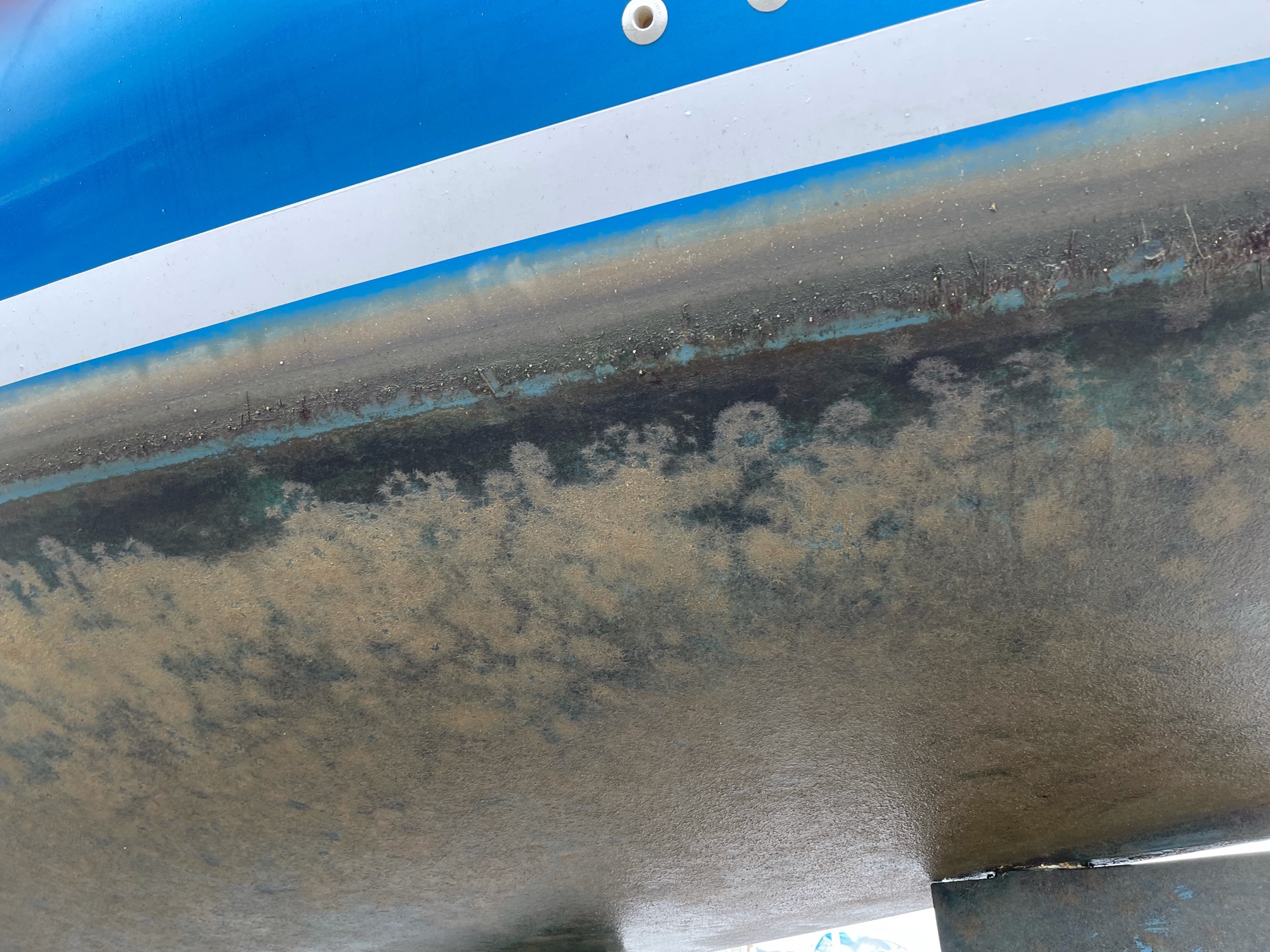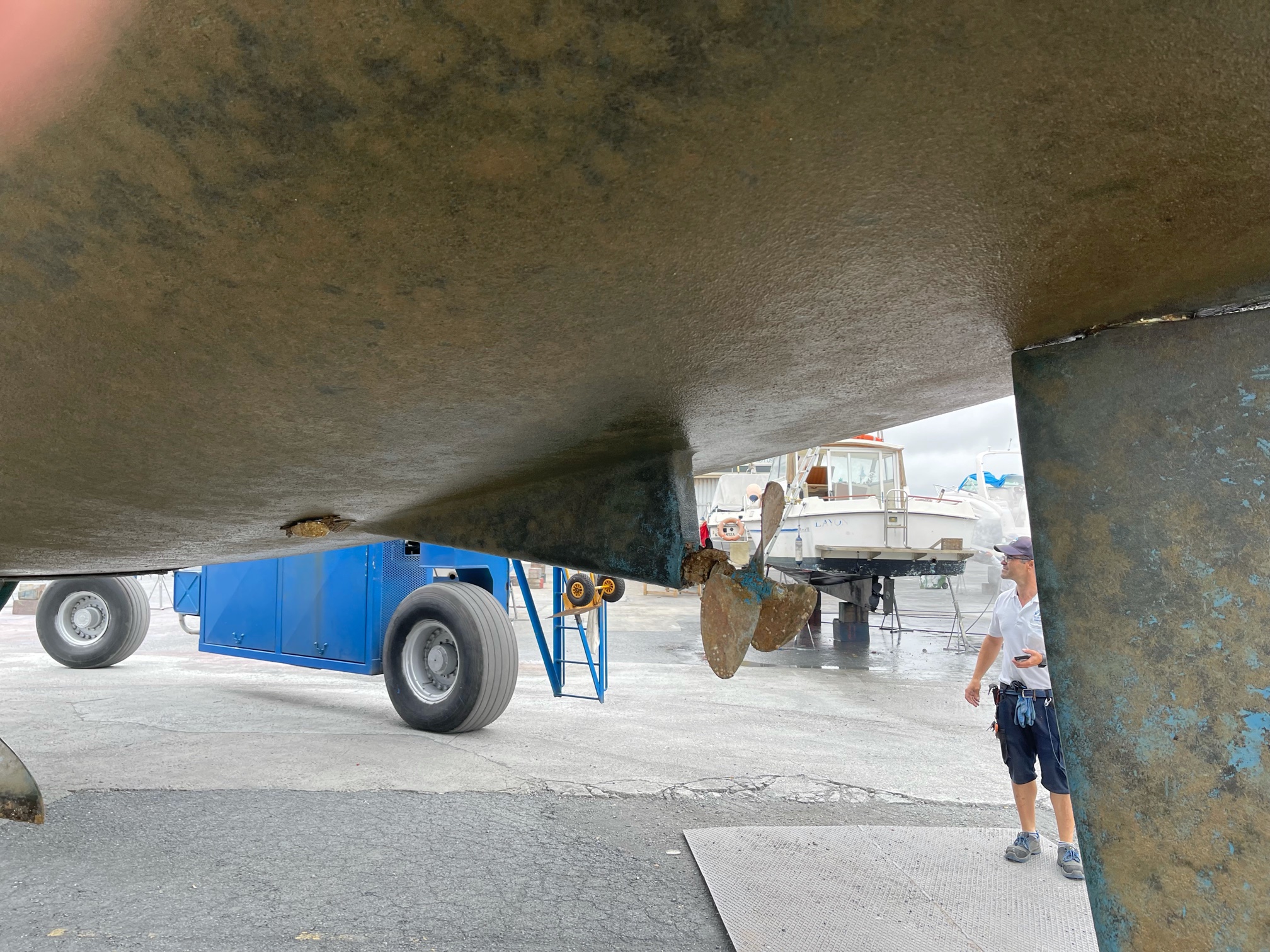 We’ve been back on board just over a week now and in that time we’ve lifted the boat, scraped and painted her bum, repaired the damaged vinyl, fitted the last bits of rubbing strake, engine check, generator check, watermaker check, and air-con check as well as all the other services including water tanks, gas lines and poo pipes and seacocks and splashed her back in. Considering the length of time she was just sitting there, she was relatively clean as you can see from the first three pictures.